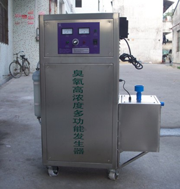 1. 直接吹送法:適用于容積較小的車間 1.1將機器安裝在消毒間外通風(fēng)干燥的地方。 1.2連接臭氧硅膠輸送管,管道出氣口應(yīng)置于車間內(nèi)2/3以上的高度,以便于臭氧彌漫于整個消毒間。20克以下為風(fēng)冷臭氧發(fā)生器,通電直接使用;20克以上為風(fēng)冷+水冷臭氧發(fā)生器,需要外接冷卻水。 外接冷卻水的方法有兩種:直接連接自來水或用水箱+循環(huán)泵做一個循環(huán)利用的 水系統(tǒng)。下圖為外接冷卻水箱的40克臭氧發(fā)生器: